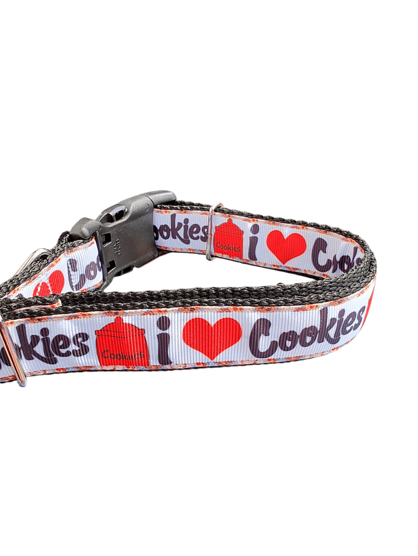 Imagine a dog collar that's not just functional, but a heartfelt tribute to your furry friend's love for treats—crafted with the playful "I Heart Cookies" design on tough nylon webbing. This isn't your average pet accessory; it's a handmade masterpiece from the USA, built to withstand the adventures of even the most energetic pups. With options for 4,200 lb or 6,100 lb strength nylon, this collar ensures your dog stays secure during hikes, park romps, or everyday strolls, all while giving back to homeless pets in the community.