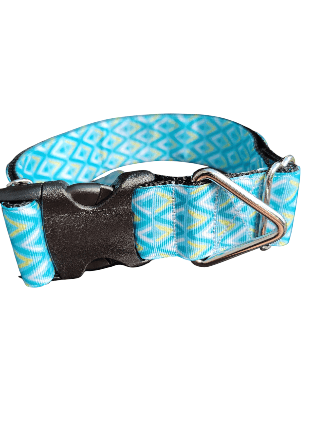 Discover the reliability and style of our 1.5-inch wide blue zig zag nylon dog collar, a handmade essential designed for dogs that live life to the fullest. Crafted in the USA from tough nylon webbing with a striking blue zig zag pattern, this collar isn't just about looks—it's engineered for everyday adventures, whether your pup is romping through parks or joining you on hikes. Unlike standard collars that might wear out quickly, this one boasts a 4,200-pound strength rating, ensuring it holds up against pulling, chewing, and rough play.